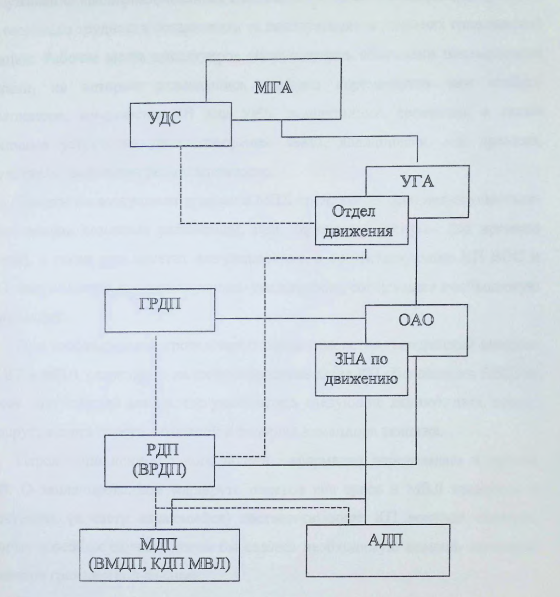 Организационная структура органов УВД ГА в МГА СССР после 1965, 1973 гг.МГА - Министерство гражанской авиации СССР. УДС - Управление движением самолетов МГА СССР УГА - Управление гражданской авиации по ЕС УВД ГРДП - Главный районный диспетчерский пункт РДП (ВРДП) - Районный диспетчерский пункт (вспомогательный районный диспетчерский пункт) ОАО - Объединенные авиационные отряды. ЗНА по движению - Заместитель началника аэрпорта по движению МДП (ВМДП, КДП МВЛ) - Местный диспетчерский пункт (вспомогательный местный диспетчерский пункт, командно-диспетчерский пункт местных воздушных линий) АДП - Аэродромный диспетчерский пункт |
