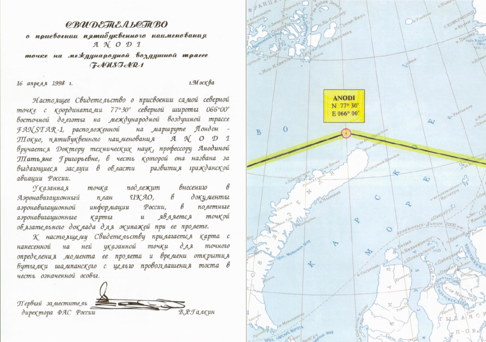 - Свидетельство о присвоении пятибуквенного наименования ANODI точке на международной воздушной трассе.